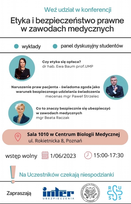 Serdecznie zapraszamy studentki i studentów Uniwersytetu Medycznego im. Karola Marcinkowskiego w Poznaniu do udziału w konferencji "Etyka i bezpieczeństwo prawne w zawodach medycznych", która odbędzie się 1 czerwca 2023 r. w godz. od 15:00 do 17:30 w sali 1010 w Centrum Biologii Medycznej UMP.