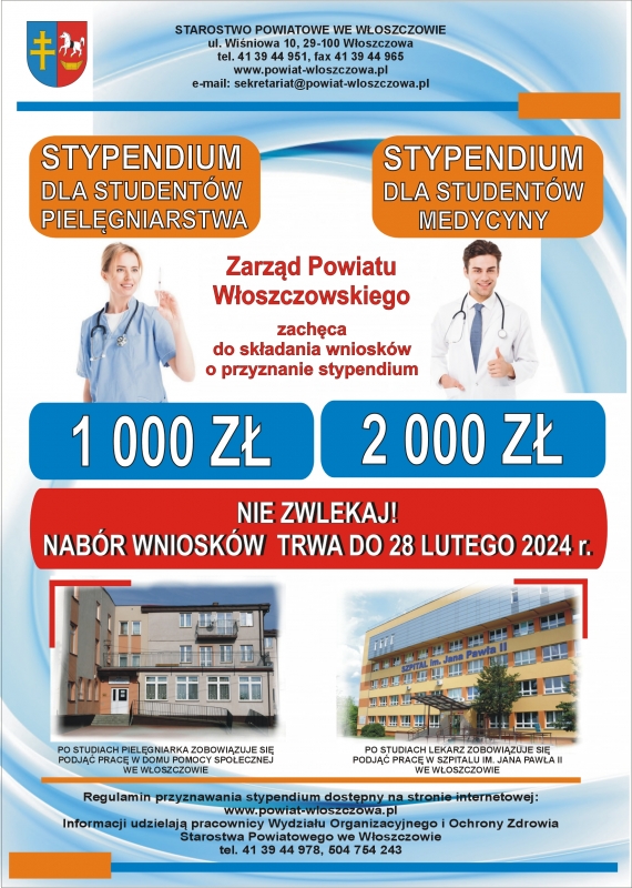 Szczegóły dostępne na stronie internetowej https://bip.powiat-wloszczowa.pl/aktualnosci/ogloszenie-o-naborze-wnioskow-o-przyznanie-stypendium-studentom-ksztalcacym-sie-na-kierunku-pielegniarstwo.html